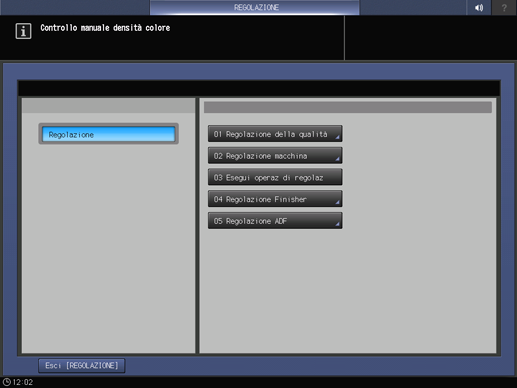 Premere OK, quindi premere Esci [REGOLAZIONE] nella schermata Menu Regolazione. Una volta usciti dalla schermata Menu Regolazione, la macchina avvia l'operazione di regolazione.
