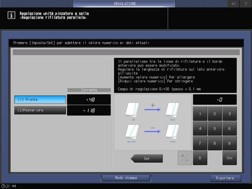 Premere in sequenza Regolazione Finisher, Regol.unità pinzatore sella e Reg. rifilatura parallela.