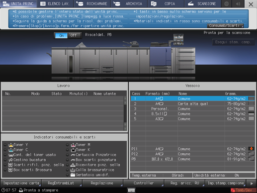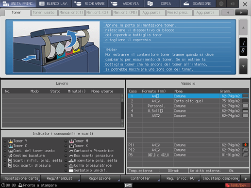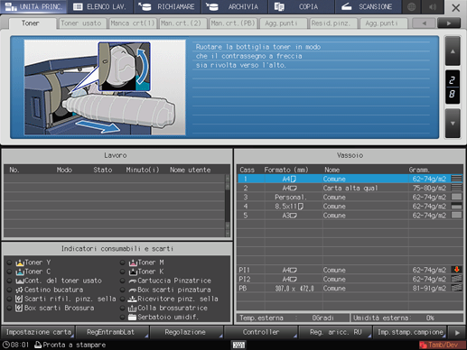 Quando è visualizzata la schermata MACCHINA, sono visualizzate le istruzioni per sostituire il toner, sostituire i contenitori del toner usato, sostituire la scatola Cyclone, aggiungere punti pinzatura, smaltire gli scarti di pinzatura, foratura e rifilatura, fornire pellet colla, rabboccare acqua nel serbatoio umidificatore e caricare carta.