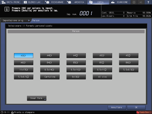 spiegazione aggiuntivaPer tornare alla schermata Imm. form. person., premere OK. Il formato richiamato è visualizzato nella schermata Imm. form. person.