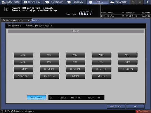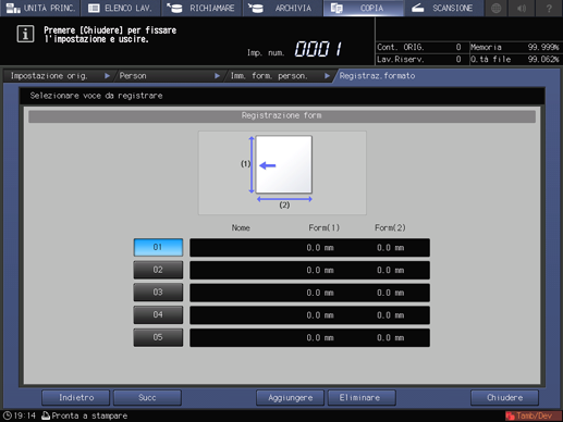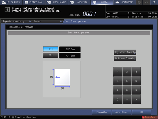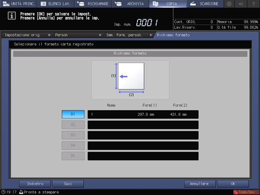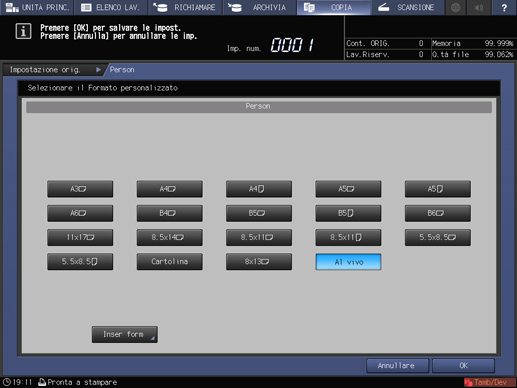 precondizioneÈ possibile registrare le dimensioni personalizzate. Le informazioni sui formati registrati possono essere utilizzate in seguito per le impostazioni dei formati originale e della carta da copia.