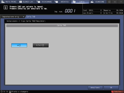 precondizionePer la copia della parte TAB, è necessaria l'Impostazione carta oltre che l'Impostazione originale. Specificare la carta TAB per il vassoio in Impostazione carta. Per informazioni dettagliate, fare riferimento a Impostazione carta in un vassoio carta.