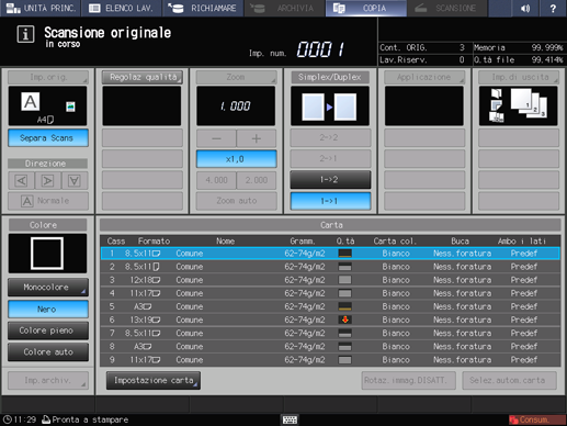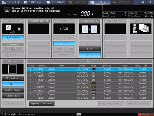 precondizioneNon vi sono limiti al numero massimo di fogli per lavoro che è possibile scansionare nella modalità Separa Scans. Dipende dallo spazio libero sull'HDD. La macchina è in grado di scansionare circa 22.000 pagine di formato equivalente a A4.