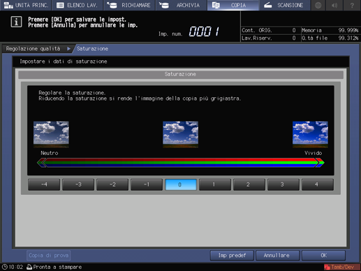 La schermata torna alla schermata COPIA. L'indicazione Saturazione è disponibile in Regolaz. qualità nella schermata COPIA.