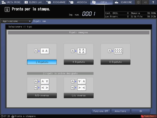 Per annullare la funzione Ripeti immagine con l'impostazione corrente salvata, premere Funzione OFF.