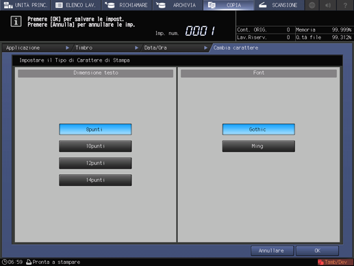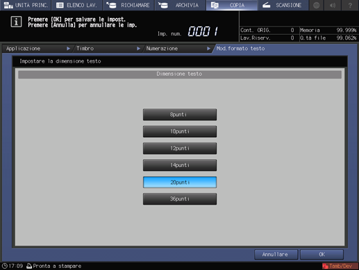 Usare questa funzione per specificare la dimensione testo di N. pagine e Data/Ora.