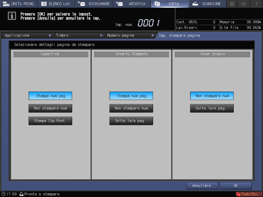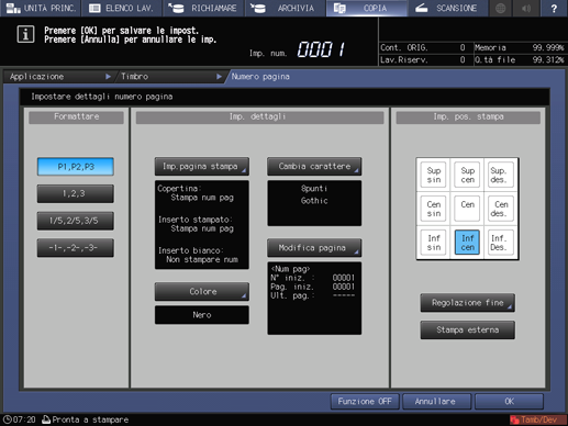 spiegazione aggiuntivaUsare il tastierino numerico del pannello a sfioramento o downup per inserire la pagina iniziale nell'intervallo compreso tra 1 e 99999. L'inserimento di 0 imposta automaticamente la pagina iniziale su 1.