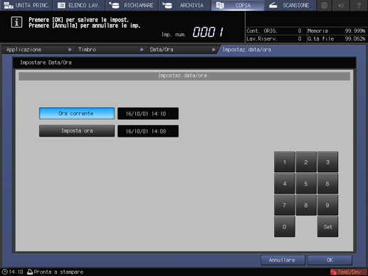 spiegazione aggiuntivaOgni volta che si preme Imposta, il cursore si sposta al campo successivo, in base all'ordine mese, giorno, anno e ora. Utilizzare il tastierino numerico per inserire i numeri desiderati.
