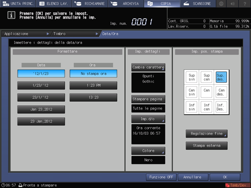 Per la data e ora, impostare Formato, Impostazioni di dettaglio (Cambia carattere, Stampa pagina, Data/Ora, e Colore), e Imp. pos. stampa.