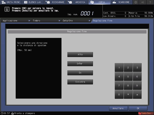 Eseguire le regolazioni fini per la posizione di stampa di Imposta numerazione, Numero pagina, Data/Ora e Annotazione. L'intervallo di regolazione è compreso tra 0 e 50 mm in lunghezza (Alto o Infer) e in larghezza (Dx o Sinistra).