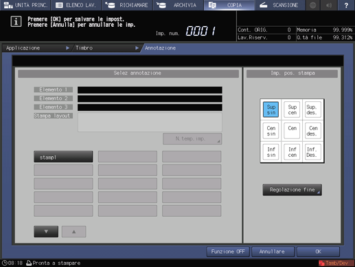 L'amministratore può modificare l'ordine del testo, data/ora e numero di annotazione e se stamparli/nasconderli in UTILITÀ. Per informazioni dettagliate, fare riferimento a [Impostazione annotazione].