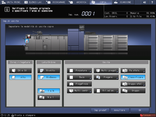 precondizioneLa macchina è impostata per abbinare automaticamente la Direz.rilegatura in Imp. di uscita delle copie a quella dell'originale.