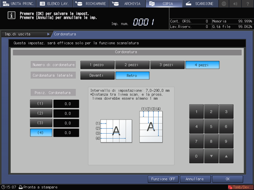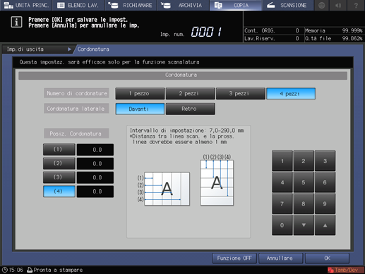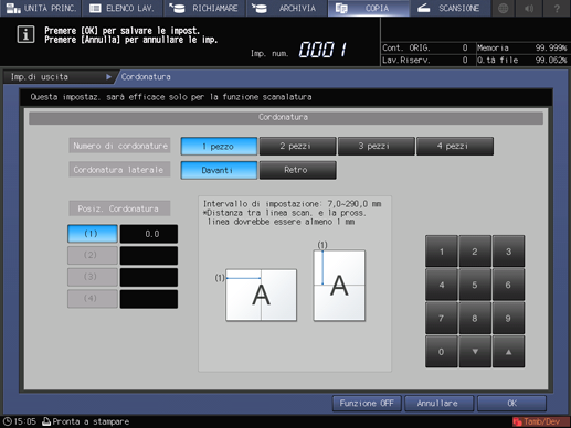 Numero di cordonature Selezionare il valore desiderato tra 1 pezzo, 2 pezzi, 3 pezzi e 4 pezzi. Lunghezza carta La: da 240 mm a 336 mm Lunghezza carta Lb: da 337 mm a 488 mm | 1 pezzo: applica uno scanalatura. Posizione scanalatura (1): Carta La: 7 mm a (La - 46) mm (incrementi di 0,1 mm) Carta Lb: (Lb - 330) mm a 290 mm (incrementi di 0,1 mm) |