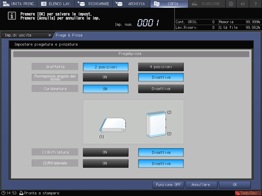 spiegazione aggiuntivaQuando PiegaPinza è selezionato al punto 5, selezionare 2 punti o 4 punti in Pinzatura, quindi selezionare anche ON o OFF in (1) Rifilatura.