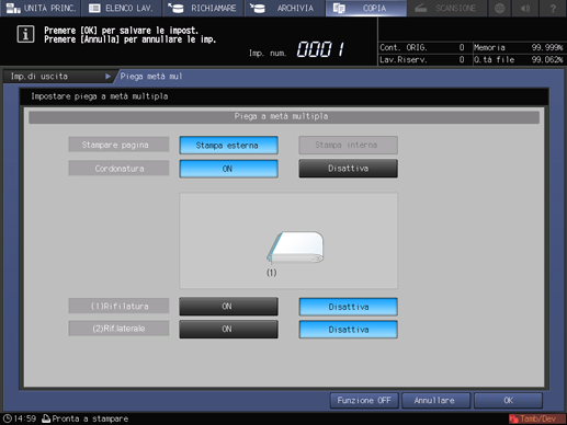 Questa operazione visualizza la schermata di impostazione Piega & Pinza o Piega a metà multipla.