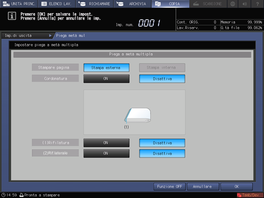 Questa operazione visualizza la schermata di impostazione Piega & Pinza o Piega a metà multipla.