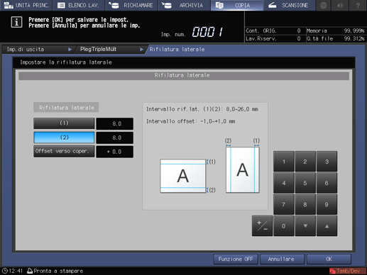 spiegazione aggiuntivaMulti piega 3 e Rif.laterale sono evidenziati. Premendo Rif.laterale è possibile modificare l'impostazione della rifilatura laterale.