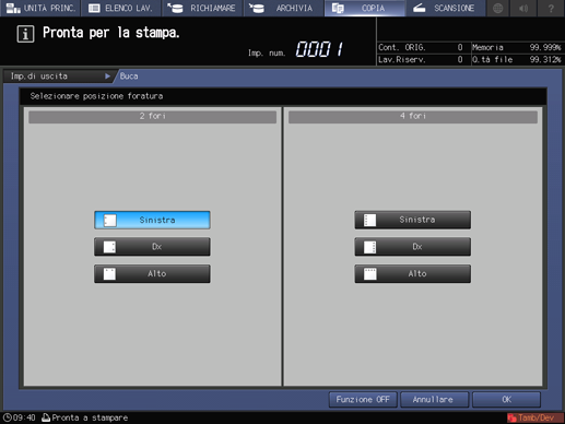 Realizza dei fori per l'archiviazione nelle copie in uscita. Attuare la procedura seguente per selezionare la foratura a 2, 3, o 4 fori e la posizione dei fori.