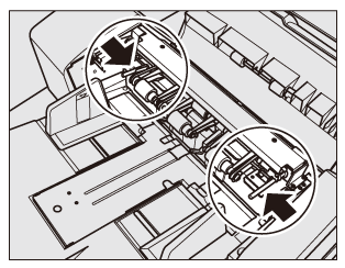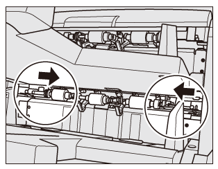 Tre rulli di alimentazione sono attaccati a ognuno del vassoio superiore e inferiore e utilizzati per alimentare i fogli. Il blocco dei rulli su entrambi i lati e l'utilizzo solo del rullo centrale può contribuire a evitare l'inclinazione delle copertine di formato piccolo.
