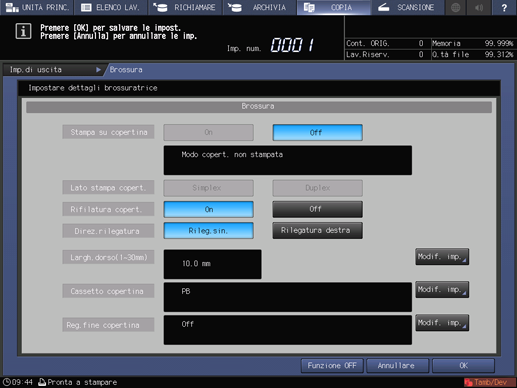 L'icona Brossura è visualizzata in Imp.di uscita nella schermata COPIA.