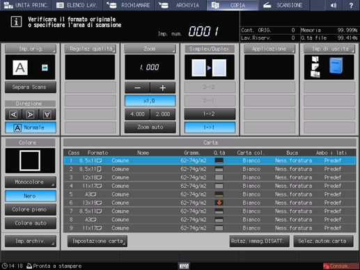 spiegazione aggiuntivaL'impostazione carta per le copertine è disponibile anche nella schermata MACCHINA o in quella COPIA. Eseguire la procedura di impostazione carta dopo il punto 4, se lo si desidera.