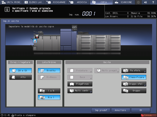 È possibile modificare l'impostazione iniziale della modalità di uscita. Per informazioni dettagliate, fare riferimento a [Imp iniziale copia].