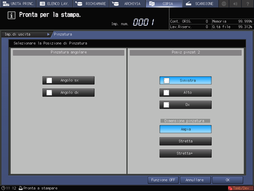 spiegazione aggiuntivaQuando si seleziona una delle voci di Posiz pinzat 2, selezionare anche Amplia, Stretta, o Stretta+ per specificare la dimensione pinzatura.