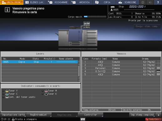A questo punto, il messaggio Vassoio piegatrice pieno/Rimuovere la carta è visualizzata nell'area dei messaggi dello schermo e il LED di avvio diventa arancione. La macchina non è in grado di riprendere la stampa, neanche se si preme Avvio nel pannello di controllo.