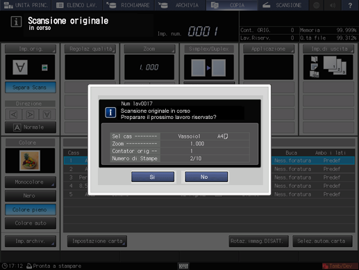 spiegazione aggiuntivaPer tornare alla schermata COPIA per eseguire un'altra impostazione lavoro riservato, premere Sì.