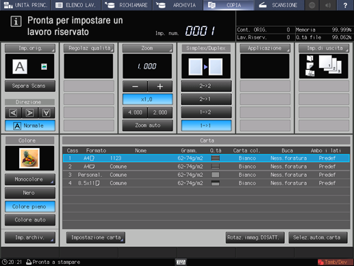 Premere la scheda COPIA per visualizzare la schermata COPIA, quindi verificare che sia visualizzato il messaggio Pronta per impostare un lavoro riservato.