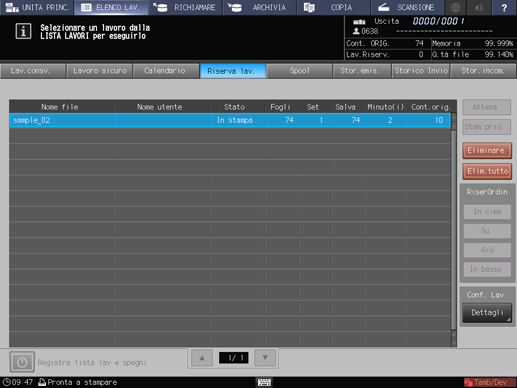 La stampa è avviata dopo che i dati sul lavoro conservato sono inviati alla schermata Lav riserv.