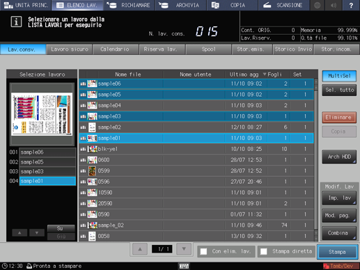 spiegazione aggiuntivaPremere Sel. tutto per selezionare tutti i lavori in elenco. Premendo questo tasto si selezionano tutti i lavori in elenco, ma MultiSel appare invece evidenziato.