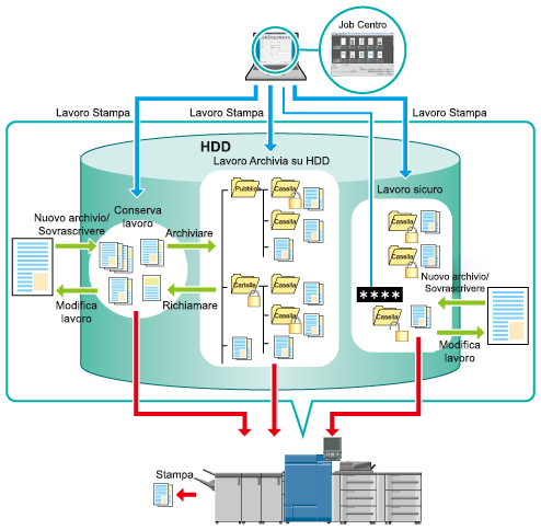 Job Centro permette di monitorare un'ampia gamma di operazioni, dalla ricezione dei dati dei lavori nel controller immagine all'emissione della stampa, fino alla verifica dei lavori attivi, conservati, sicuri o HDD. Utilizzando Job Centro, è possibile eseguire i lavori che rientrano nella gamma menzionata in precedenza. Inoltre, è possibile usare le funzioni di modifica lavoro e modifica pagine di Job Centro per modificare lavori nella coda Conserva della macchina.