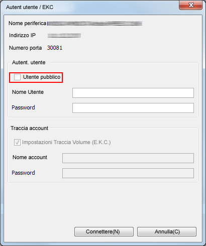Se la funzione di traccia account è impostata nella macchina, è selezionatoImpostazioni Traccia Volume (E.K.C.). Inserire il nome account e password.