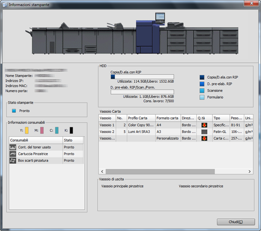 HDD | Visualizza in formato grafico e in valori numerici la quantità utilizzata e lo spazio libero per la copia e i dati RIP usati per il lavoro. Visualizza inoltre formato grafico e in valori numerici la quantità utilizzata e lo spazio libero per i dati Pre-RIP, la scansione e il formulario. È visualizzato anche il numero dei lavori conservati. |