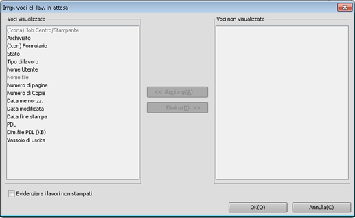 È possibile impostare le voci da visualizzare nell'elenco Lavoro attivo, l'elenco Cons. lavoro, l'elenco Lavoro HDD, l'elenco Lavoro sicuro e la schermata Cronologia lavori.