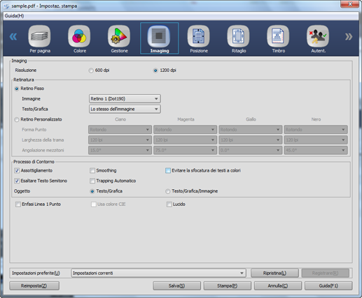 Le voci di impostazioni sono le stesse di quelle della schermata Imaging del driver Plug-in PS, fatto salvo per PDF RIP. Per informazioni dettagliate sulla descrizione delle voci di impostazione comuni, fare riferimento a [Retinatura immagine].