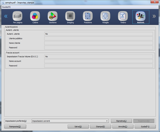 Nella schermata Autenticazione del driver Plug-in PS, occorre inserire le informazioni di impostazione dell'autenticazione utente o della traccia account o di entrambi. Tuttavia, Job Centro visualizza automaticamente le informazioni di impostazione, per cui non è necessario inserire le informazioni. Per informazioni dettagliate sulla descrizione delle voci di impostazione, fare riferimento a Schermata [Autent.].