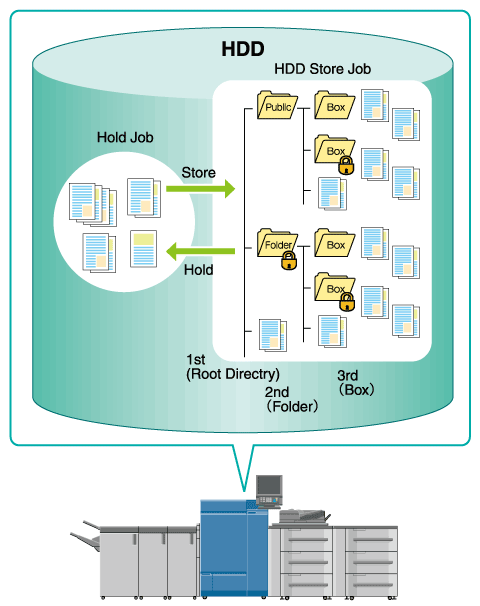 Inoltre i lavori salvati sull'HDD possono essere gestiti tramite cartelle e box utente.
