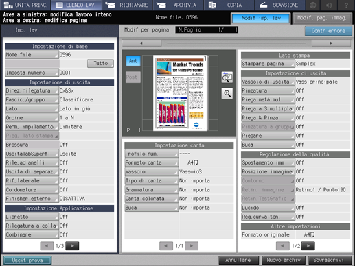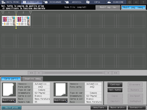 Premere Imp. lav o Mod. pagina. Premendo Imp. lav, si visualizza la schermata Modif imp. lav, in cui è possibile modificare le impostazioni di stampa. Premendo Mod. pagina, si visualizza la schermata Modif. pag. immag., in cui è possibile modificare un lavoro pagina per pagina.