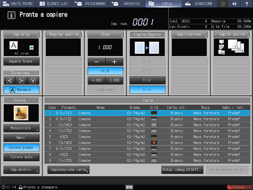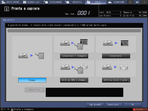 precondizioneIl numero dei lavori conservati è visualizzato nell'area dei messaggi della schermata Conserva lavoro. Il display diventa rosso quando il numero dei lavori conservati supera 450.