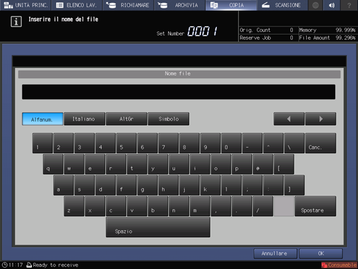 È possibile omettere l'immissione del Nome file. In questo caso, la macchina assegna le ultime 4 cifre dell'ID lavoro alla creazione automatica.