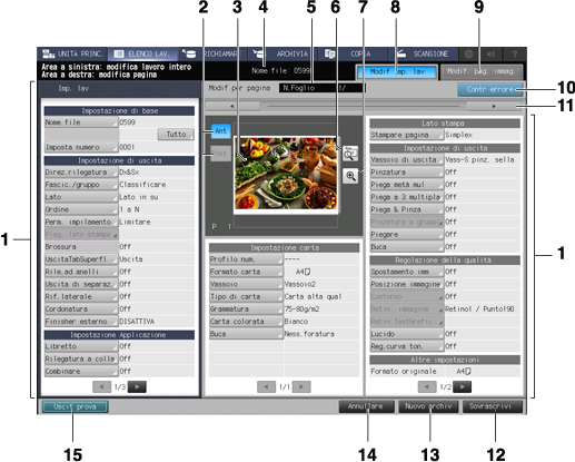 15 | Uscit prova | Premere questo pulsante per emettere e controllare l'impostazione modificata. Come destinazione di uscita è possibile specificare un singolo set, un foglio dell'anteprima, oppure un foglio. |
