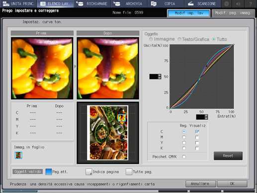 È possibile regolare la luminosità e il contrasto generali di ogni colore modificando la curva di tonalità di ogni CMYK o la curva di tonalità del pacchetto CMYK sui dati immagine del lavoro conservato. È anche possibile regolare la curva di tonalità di ogni tag (immagine o testo/grafica).
