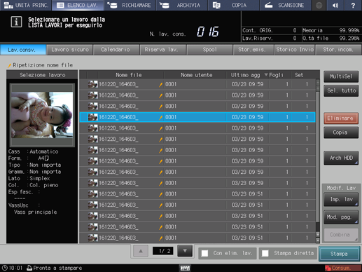 spiegazione aggiuntivaSe è presente un lavoro che è stato spostato da Lav riserv, viene visualizzato Lavori da lavoro riservato in alto e al centro dell'elenco. Non è possibile copiare i lavori spostati da Lav Riserv. Per questi lavori viene visualizzata un'icona blu