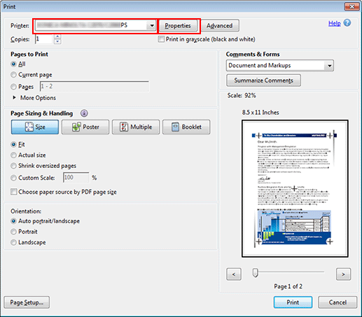 Selezionare la stampante da usare per la stampa e fare clic su Proprietà.