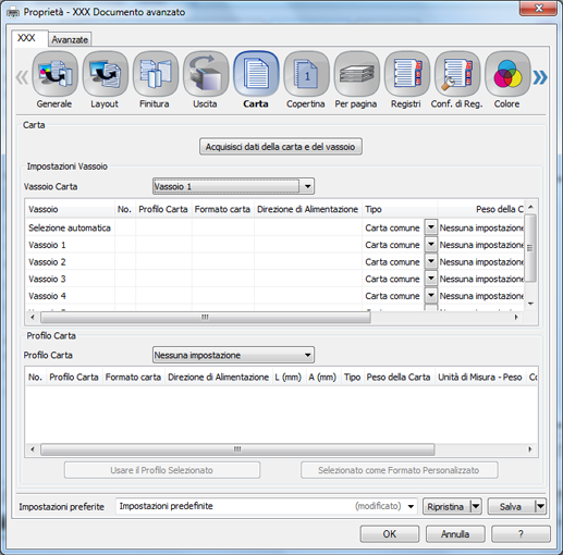spiegazione aggiuntivaSe le impostazioni specificate non sono visualizzate nell'anteprima, fare clic su Acquisisci informazioni periferica nella scheda Configura per ottenere le informazioni periferica.