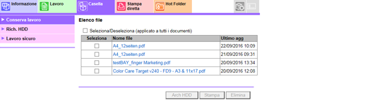 Conserva lavoro | Il lavoro conservato può essere verificato, memorizzato nell'HDD interno o stampato. |