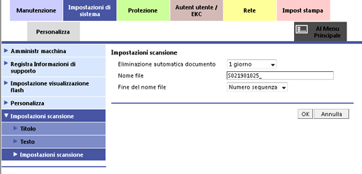 Inserire una stringa di testo desiderata nella casella di testo Nome file, la quale deve essere aggiunta automaticamente al nome file. È possibile inserire fino a 32 caratteri monobyte (i caratteri non accettabili sono: " / * | : < > ? , ' ` ^ ) ( } { ] [ +).