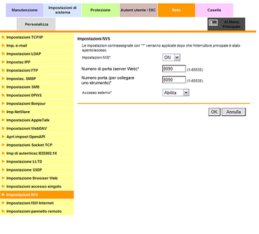 Questa schermata consente di selezionare se usare IWS (Internal Web Server ). La funzione IWS consente di trasferire un'applicazione per la conversione dei dati di stampa alla macchina e usare la funzione di conversione dati di stampa e altre funzioni.